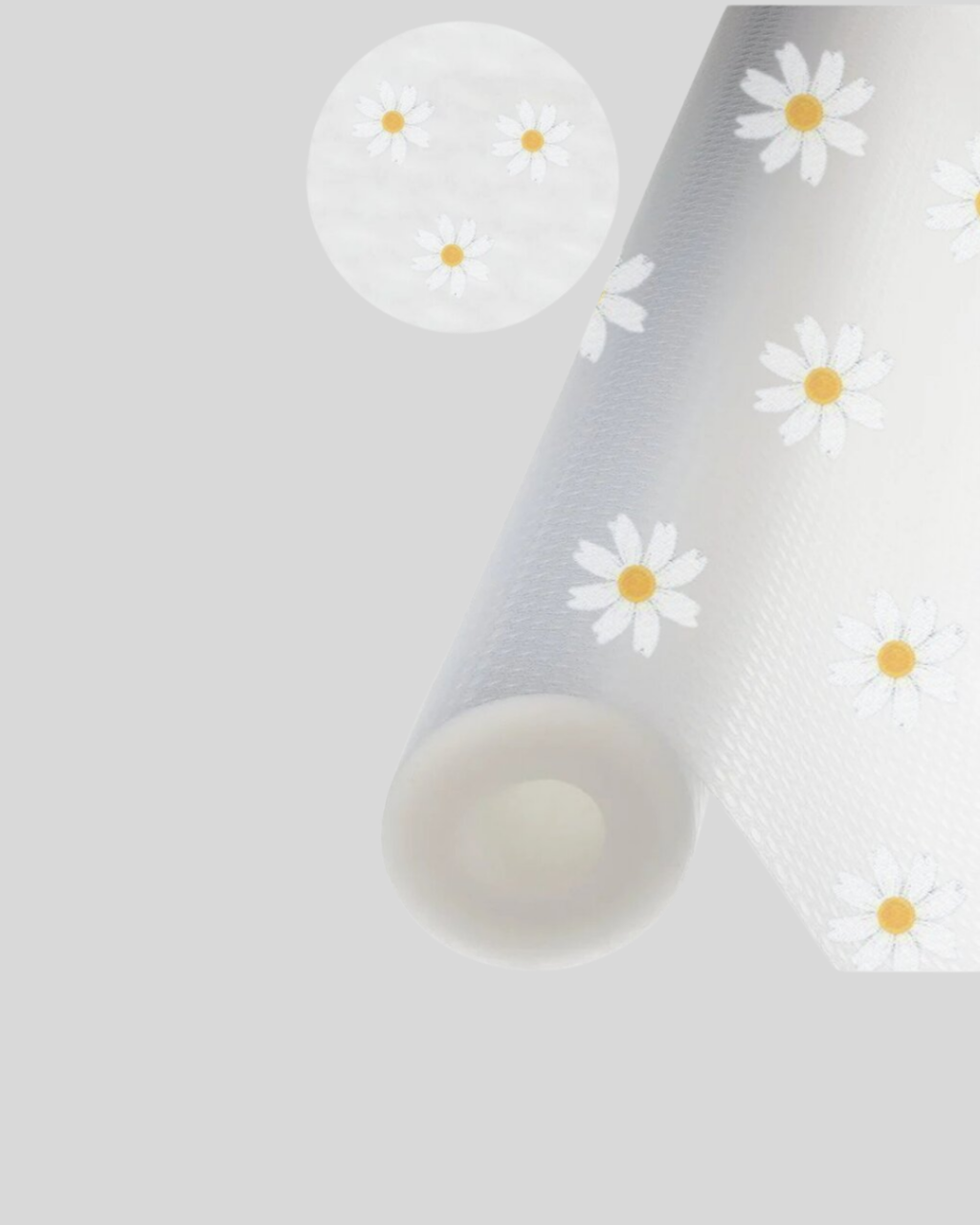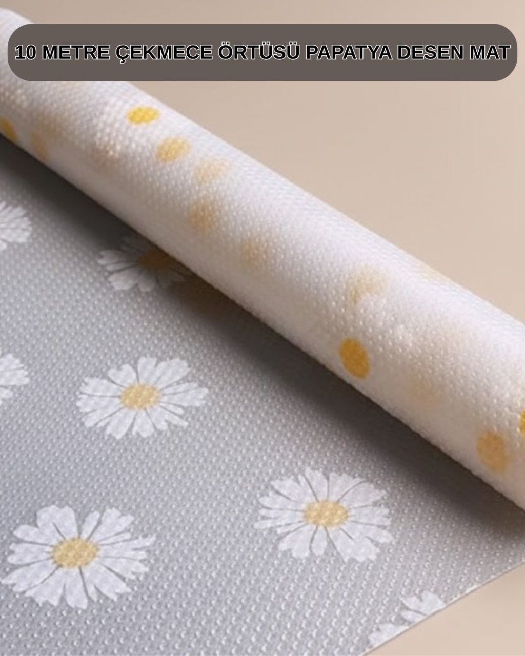 Papatya desenli bu çekmece ve dolap içi örtü, 10 metre uzunluğu ile çoklu kullanım imkânı sunar. Kesilerek farklı alanlarda kullanılabilir.Kaymaz yapısı sayesinde eşyalar sabit kalır. Yapışmaz özelliği yüzeylere zarar vermez. Kolay temizlenir ve uzun süre kullanılabilir.