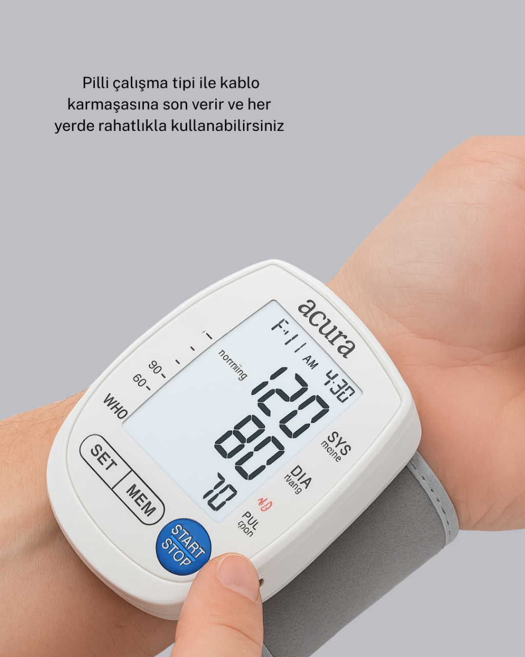 Hem pilli hem şarjlı kullanım sunan bu dijital bilek tansiyon aleti, pratik ve güvenilir ölçüm yapabilmeniz için son teknoloji ile donatılmıştır. Bileğe kolayca yerleştirilen cihaz tek tuşla ölçümü başlatır ve saniyeler içinde tansiyon sonuçlarını ekranda gösterir. Büyük dijital ekran, özellikle yaşlı kullanıcılar için büyük bir avantaj sağlar. Hafıza özelliği, ölçümlerinizi kaydederek tansiyon değişimlerinizi düzenli olarak takip etmenize yardımcı olur. Bu sayede sağlık kontrolünüz daha düzenli hâle gelir. Pilli kullanım, dış mekânda özgürlük sağlarken, şarjlı kullanım ekonomik ve uzun ömürlüdür. Hafif ve ergonomik yapısı ile her ortamda rahatlıkla kullanılabilir. Kompakt tasarımı sayesinde çantanızda kolayca taşıyabilirsiniz. Hem günlük kullanımda hem de acil durumlarda tansiyon takibini hızla yapmanızı sağlar.