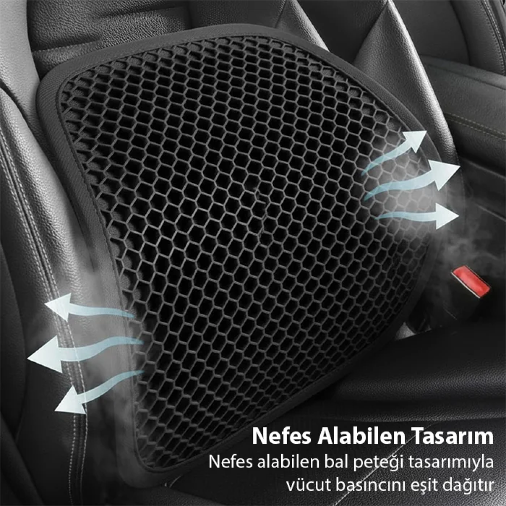 Araba koltuğunda, ofiste veya evde uzun saatler oturanlar için tasarlandı. Bal peteği şeklindeki nefes alabilen jel yapısı sayesinde vücut basıncını dengeler, terlemeyi önler ve doğru oturma pozisyonunu destekler.