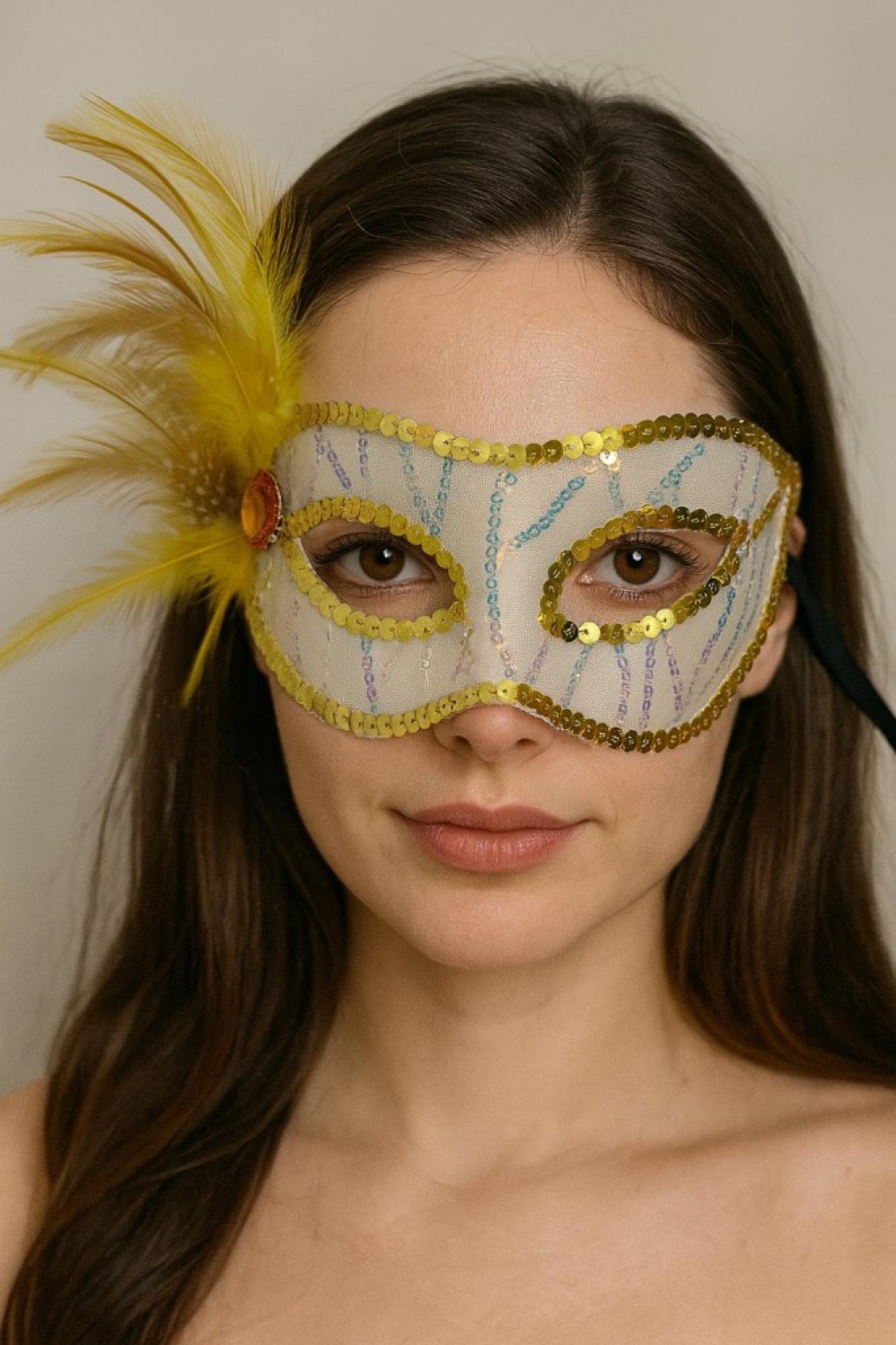 Altın Renk Yandan Tüylü Pul Payet İşlemeli Parti Maskesi 23x12 cm