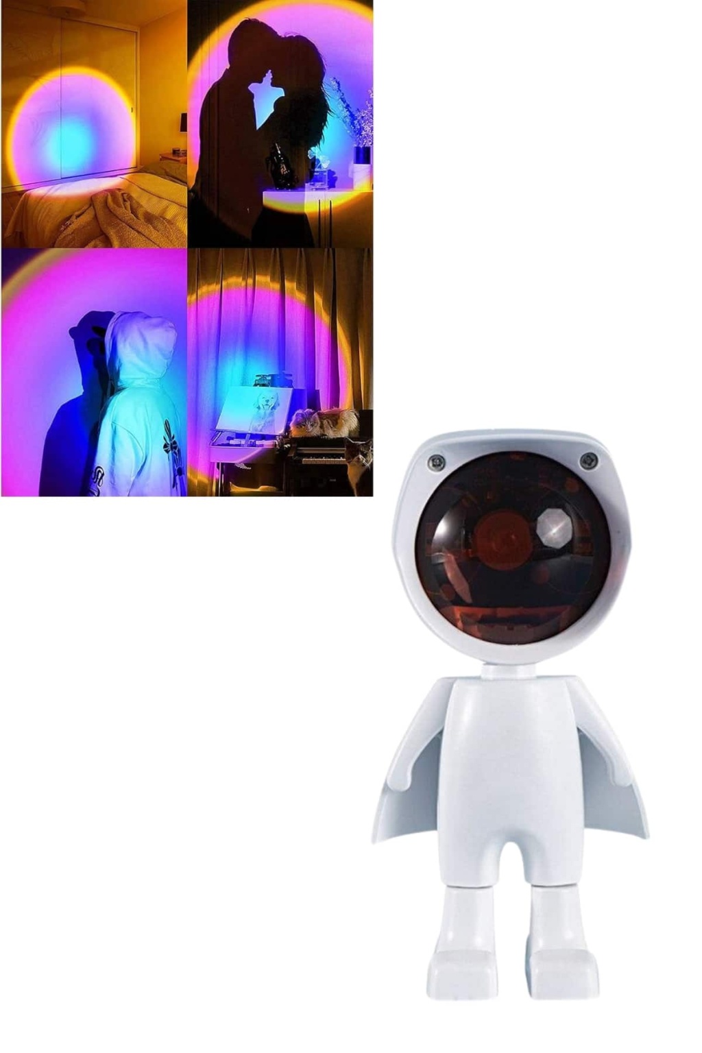 Gün batımı efektli bu şarjlı lamba, sevimli astronot tasarımı ile dikkat çeken hem işlevsel hem de dekoratif bir aydınlatma çözümüdür. LED ışık kaynağı sayesinde loş, yumuşak ve sıcak bir aydınlatma sunar; böylece ortamda huzurlu ve sakin bir atmosfer yaratır. Özellikle yatak odası, oturma odası ya da çalışma alanları gibi kişisel yaşam alanlarında hem gece lambası hem de ortam ışığı olarak rahatlıkla kullanılabilir.360 derece dönebilen başlığı ve 60 derece yukarı-aşağı hareket kabiliyeti sayesinde ışığın açısını kolaylıkla ayarlayabilir, istediğiniz duvar ya da alana doğrudan yansıtabilirsiniz. Bu sayede yalnızca ortama ışık vermekle kalmaz, aynı zamanda dekoratif bir efekt yaratır. Kompakt ve taşınabilir yapısıyla ev dışında da rahatlıkla kullanılabilir; ister seyahatlerde ister dış mekân etkinliklerinde şarjlı yapısıyla kablosuz olarak yanınızda taşıyabilirsiniz.USB kablosu ile kolayca şarj edilen bu ürün, tam dolumda yaklaşık 3-4 saat kesintisiz kullanım sunar. Güç kaynağına bağlıyken ise sınırsız kullanım avantajı sağlar. Dokunmatik kontrol paneli ile ışığı açıp kapamak ve parlaklık seviyesini ayarlamak son derece pratiktir. Bu özellik, hem kullanım kolaylığı hem de modern bir deneyim sunar.Gün batımı projektör lambası, yalnızca fonksiyonel bir gece lambası değil, aynı zamanda romantik ve sıcak bir ambiyans yaratmak isteyenler için eşsiz bir aksesuardır. Film izlerken, kitap okurken ya da sadece dinlenmek istediğinizde ortamı yumuşak ışığıyla dönüştürür. Ayrıca fotoğraf ve video çekimlerinde estetik bir arka plan ışığı olarak da kullanılabilir. Şıklığı ve işlevselliği bir arada sunan bu ürün, hem kendiniz için hem de sevdiklerinize hediye olarak ideal bir tercihtir.