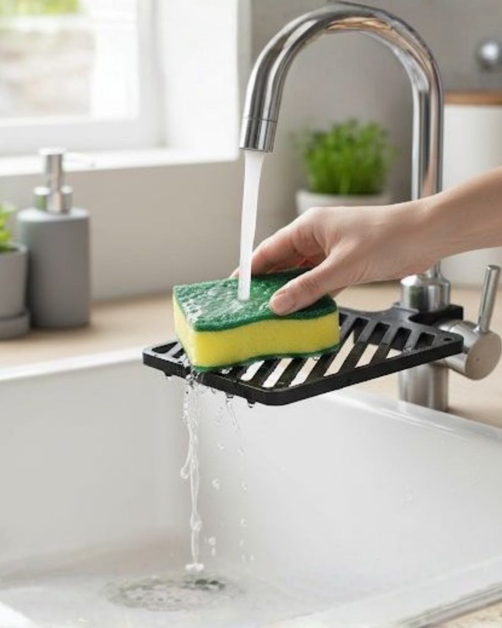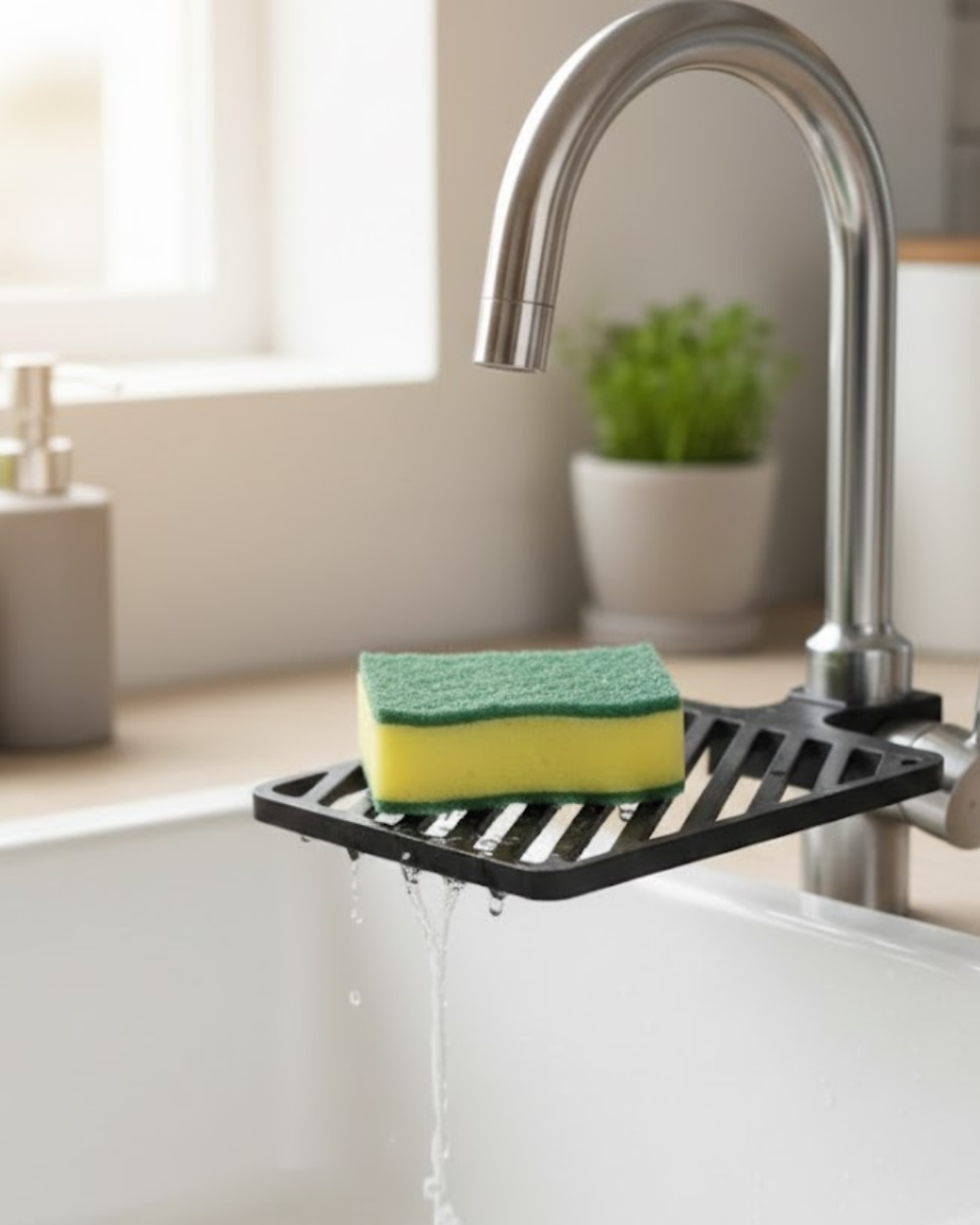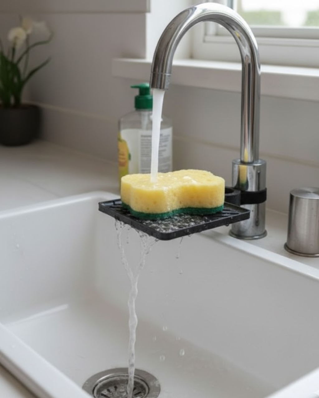 Damlama tepsili musluk sünger tutucu, mutfak süngerinin ıslak kalmasını önleyerek daha hijyenik bir kullanım sunar. Sünger, musluğa entegre edilen tepsi üzerinde durur ve yıkama sonrası akan su doğrudan evyeye yönlendirilir. Böylece tezgâh üzerinde su birikmez ve mutfak daha temiz kalır.Kompakt yapısı sayesinde az yer kaplar ve mutfak düzenini bozmaz. Süngerin sürekli ıslak yüzeyle temas etmesini engelleyerek daha uzun süre temiz kalmasına yardımcı olur. Günlük mutfak kullanımını kolaylaştıran, pratik ve düzen sağlayan fonksiyonel bir mutfak aksesuarıdır.