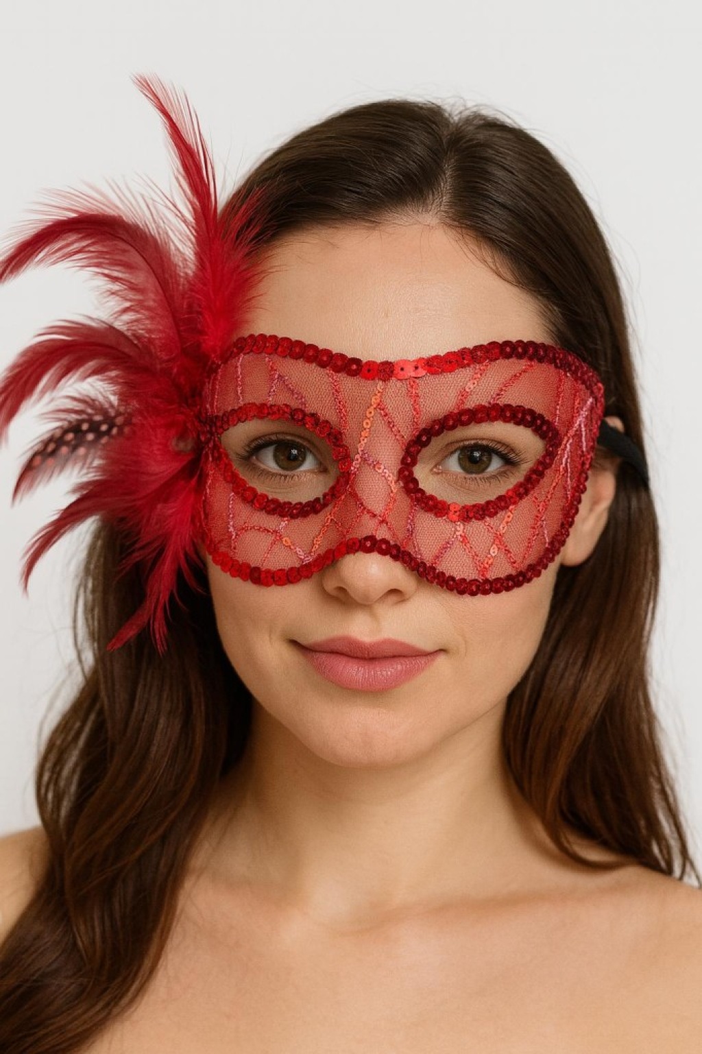 Kırmızı Renk Yandan Tüylü Pul Payet İşlemeli Parti Maskesi 23x12 cm
