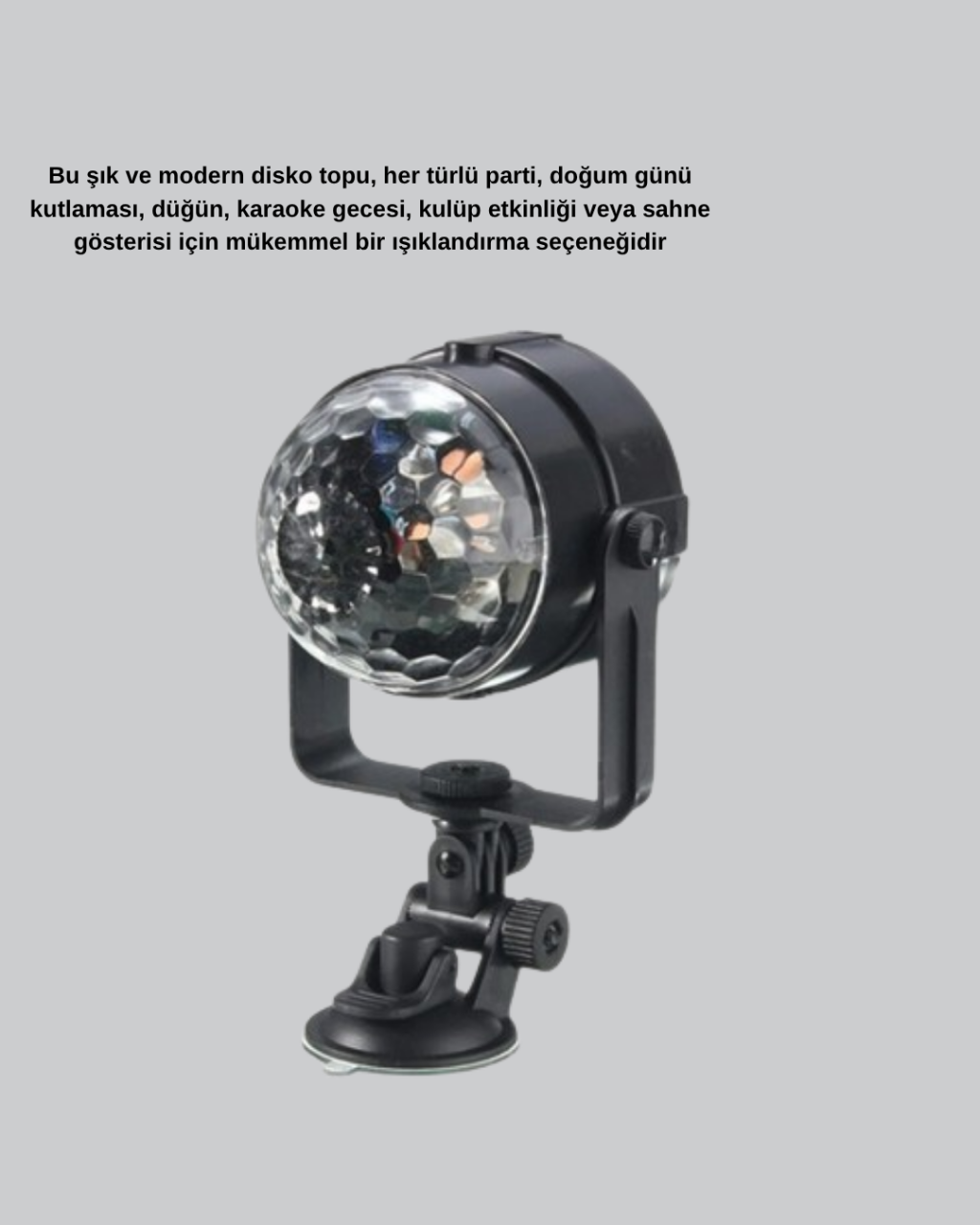 Partilerin enerjisini artırmak için tasarlanmış bu müzik ritmine duyarlı disko topu, 7 farklı renk modu ile ortamınıza büyüleyici bir atmosfer katar. Kırmızı, yeşil, mavi gibi temel renklerin yanı sıra bu renklerin karışımıyla oluşan dinamik ışık efektleri, her türlü partiye renk getirir.Müzik ritmine duyarlı entegre sensör, ses dalgalarını algılayarak ışıkların müziğin temposuna göre yanıp sönmesini sağlar. Böylece ışıklar müzikle uyum içinde hareket eder, dans pistinde eğlenceyi zirveye taşır.Ev partileri, doğum günü kutlamaları, düğünler, karaoke geceleri, kulüpler veya sahne etkinlikleri için mükemmel bir tercihtir.Enerji tasarruflu LED sistemi uzun ömürlü kullanım sunarken, düşük ısı üretimiyle güvenli bir deneyim sağlar. Hafif ve kompakt yapısı sayesinde kolay taşınabilir.Modern tasarımıyla sadece ışık değil, aynı zamanda dekoratif bir obje olarak da dikkat çeker.