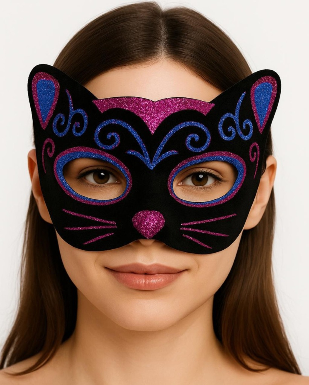 Siyah Kadife Kaplama Üzeri Pembe Mavi Sim İşlemeli Kedi Maskesi 20x13 cm
