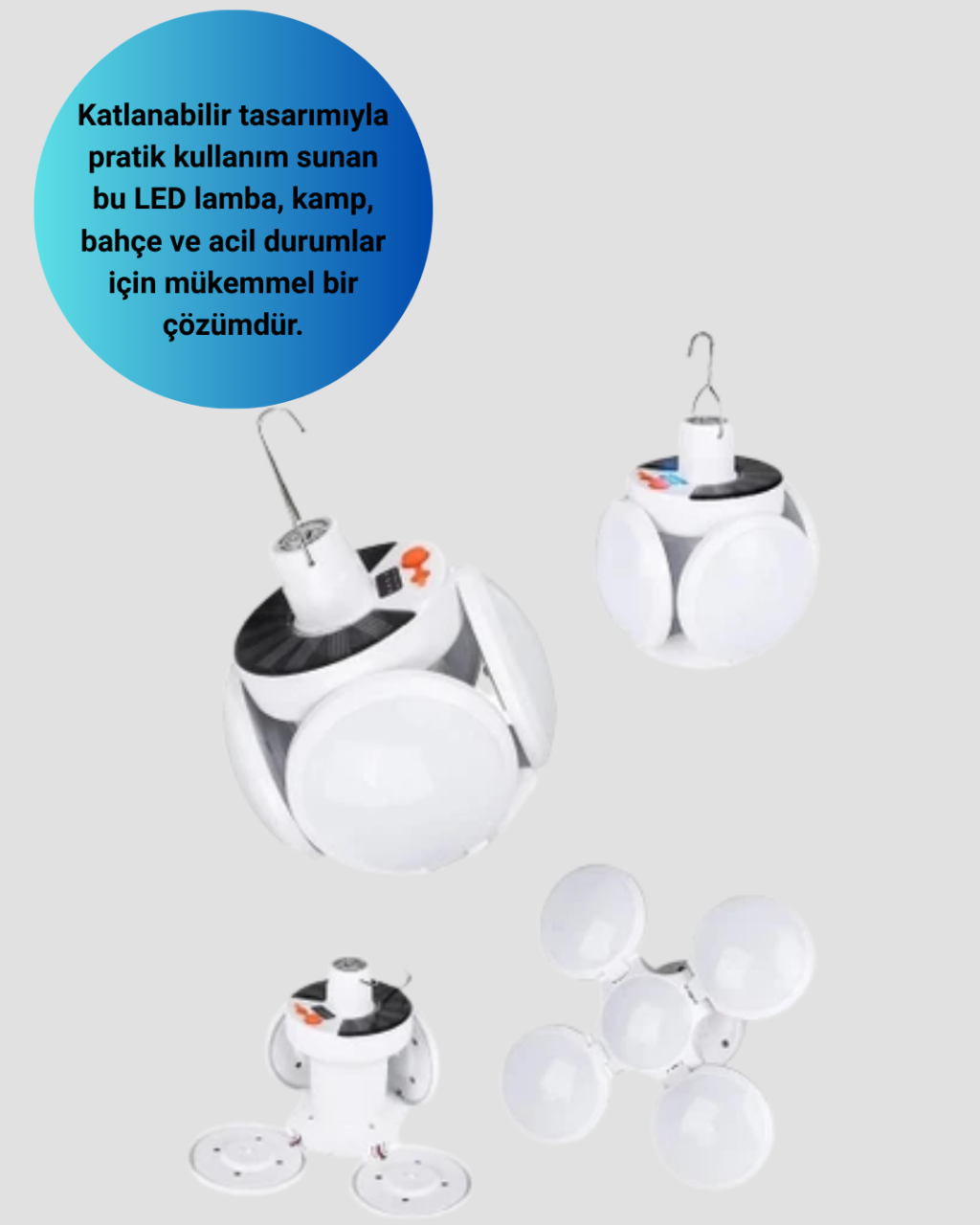 Solar enerjili katlanabilir LED lamba, 5 kanatlı tasarımıyla farklı açılarda aydınlatma imkanı sunar. 45 adet güçlü LED sayesinde geniş alanları rahatlıkla aydınlatır. 2400mAh lityum pili sayesinde 6-8 saat kesintisiz çalışır. Hem güneş enerjisiyle hem de USB kablosuyla şarj edilebilir. Katlanabilir kanatları ışığı dilediğiniz yöne yönlendirmenize imkan tanır. IP65 su geçirmez yapısı ile bahçe, kamp ve dış mekanlarda güvenle kullanılabilir. Askı aparatı sayesinde çadır, veranda veya balkonda kolayca kullanılabilir. Acil durumlarda da pratik bir aydınlatma sağlar. Çevre dostu, ekonomik ve taşınabilir yapısıyla günlük kullanım için idealdir.