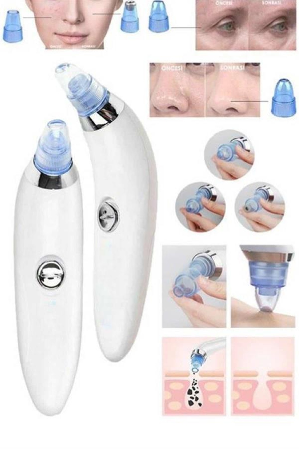 Cildinizin derinlemesine temizlenmesini sağlayan bu vakumlu siyah nokta temizleme cihazı, güçlü emiş gücü ve hassas tasarımıyla etkili ve güvenli bir bakım sunar. Profesyonel masaj sistemine sahip olan bu cihaz, kan dolaşımını destekleyerek cildinize canlılık kazandırır. Siyah noktaları ağrısız bir şekilde temizleyerek, cilt yüzeyini pürüzsüz hale getirir ve gözeneklerin görünümünü azaltır.Her cilt tipi için uygun olan 5 farklı güç seviyesi ile kişisel ihtiyaçlarınıza göre ayarlanabilir. Su geçirmez yapısı sayesinde duş sonrası ya da yüz temizliği sırasında güvenle kullanılabilir. Kompakt boyutları sayesinde hem evde hem de seyahatlerde pratik bir kullanım sunar. Cihaz, kısa devre durumunda otomatik koruma sağlayarak güvenliği ön planda tutar.Modern tasarımı ve ergonomik yapısıyla kolay kavranır; farklı işlevlere sahip 4 başlığı sayesinde cilt bakım rutininize profesyonel dokunuşlar ekler. DC5V giriş gerilimi ve 0.7W gücü ile enerji dostudur. Paket içeriğinde 1 adet vakumlu siyah nokta temizleme cihazı ve 4 farklı başlık yer almaktadır. Cildinize hak ettiği özeni bu gelişmiş cihazla gösterin.