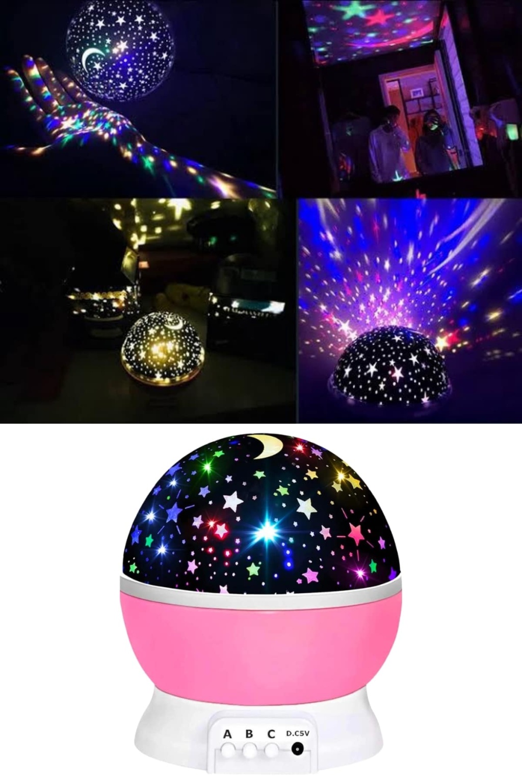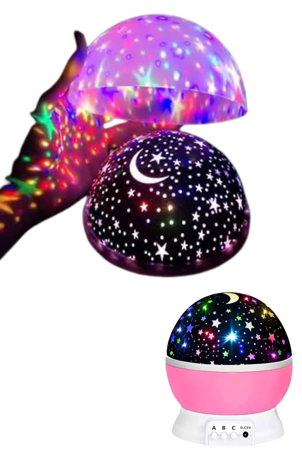 Bu gece lambası, kırmızı, yeşil, mavi, sarı gibi ana renklerin yanı sıra bu renklerin kombinasyonları ile toplamda 6 farklı ışık seçeneği sunar. LED ışık teknolojisi, hem enerji verimliliği sağlar hem de gözü rahatsız etmeyen bir parlaklık sunar. Işıklar yumuşak bir şekilde yayılır ve doğrudan gözle temas etmez, bu da özellikle uyumakta zorlanan ya da karanlıktan korkan çocuklar için büyük bir avantajdır. Lambanın üzerindeki buton sayesinde, istediğiniz zaman ışık modlarını değiştirebilir ve odanın atmosferini hızla dönüştürebilirsiniz. Özellikle renkli ışıklar sayesinde çocuklar hayal dünyalarında gezegenler, yıldızlar ve ay ile uyumak gibi eğlenceli bir deneyim yaşarlar. Aynı zamanda, bu görsel şölen uykuya dalmayı teşvik eder.